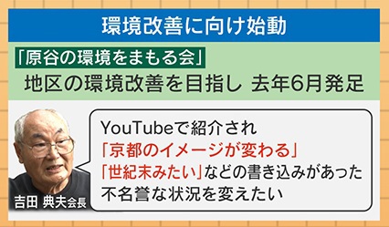 そして、『原谷の環境をまもる会』が2024年6月に発足しました。吉田会長は「YouTubeで原谷が紹介され『京都のイメージが変わる』『世紀末みたい』などの書き込みがあった。不名誉な状況を変えたい」と話しています。