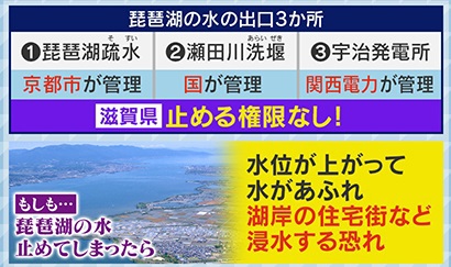 しかし、滋賀県民に悲しいお知らせです。実際に琵琶湖の水を止めると、滋賀県にとっても大変な事態が…。琵琶湖の水の出口は『琵琶湖疏水』『瀬田川洗堰(あらいぜき)』『宇治発電所』の3か所ありますが、それぞれ京都市・国・関西電力が管理していて、滋賀県に止める権限はありません。さらに、もしも琵琶湖の水を止めてしまったら、水位が上がって水があふれ、湖岸の住宅街などが浸水する恐れがあるということです。
