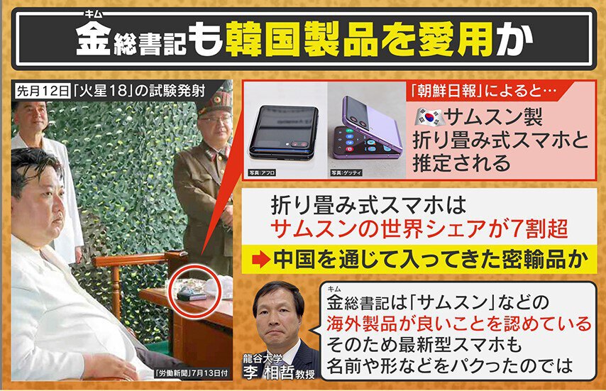 これは7月12日の「火星18」の試験発射のときの写真ですが、「朝鮮日報」によると金正恩総書記のテーブルに乗っているのが、サムスン製折り畳み式スマホと推定されるといいます。折り畳み式のスマホは、サムスンの世界シェアが7割超です。このスマホは、中国を通じて北朝鮮に入ってきた密輸品とみられます。李教授は「金総書記はサムスンなどの海外製品が良いことを認めている。そのため最新型スマホも名前や形などをパクったのでは」と話しています。