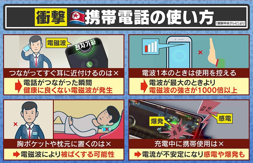 北朝鮮での携帯電話使用上の注意があります。それが、①通話がつながった後、すぐ耳に近づけるのはだめ、電話がつながる瞬間、健康に良くない電磁波が発生するため。②電波が1本のときは使用を控える。電波が最大のときより電磁波の強さが1000倍以上になるため。③胸ポケットや枕元に置いてはいけない。電磁波により被ばくする可能性があるため。④充電中に携帯を使用してはいけない。電流が不安定となり、感電事故や爆発事故が起こる。とされています。