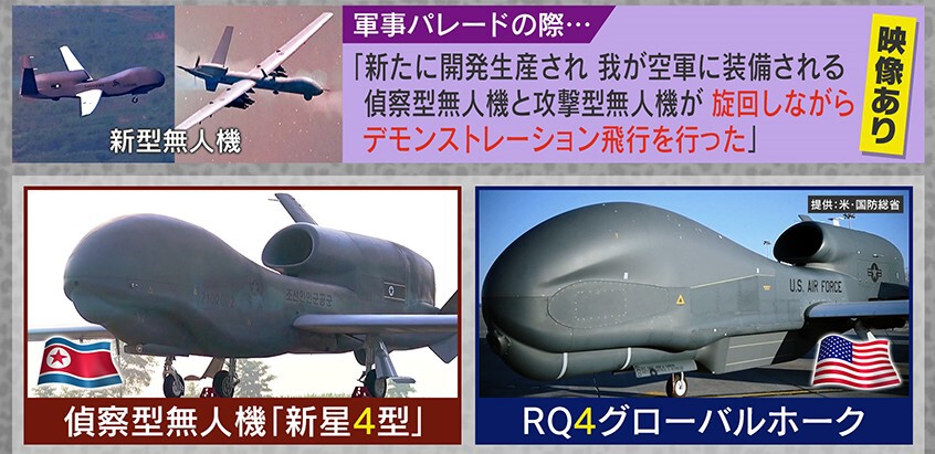 7月27日北朝鮮の戦勝記念日に軍事パレードが行われました。そこで、2種類の新型の無人機が公開され、さらに「偵察型無人機と攻撃型無人機が旋回しながらデモンストレーション飛行を行った」とされています。それらがアメリカのパクリじゃないかといわれています。左が北朝鮮の偵察型無人機「新星4型」右がアメリカの無人機「RQ4グローバルホーク」(写真参照)ですが、見た目がそっくりな上、名前の数字も4で同じです。