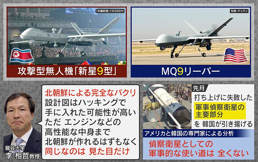 もう一機種公開されている攻撃型無人機「新星9型」ですが、これもアメリカの「MQ9リーパ」とそっくりで、数字も9で同じです。李教授によると「北朝鮮による完全なパクリ。設計図はハッキングで手に入れた可能性が高い。ただエンジンなどの高性能な中身まで北朝鮮が作れるはずもなく、同じなのは見た目だけ」ということです。さらに、7月には、北朝鮮が打ち上げに失敗した軍事偵察衛星の主要部分が韓国により引き上げられましたが、アメリカと韓国の専門家による分析では、「偵察衛星としての軍事的な使い道は全くない」といわれています。