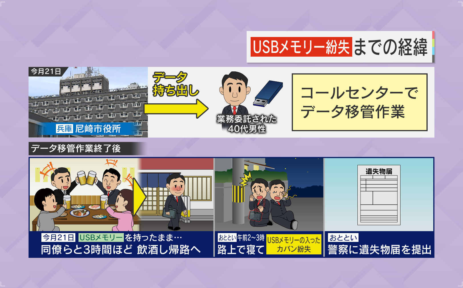 業務を委託された40代の男性は、21日、尼崎市役所からデータを持ち出してコールセンターでデータの移管作業を行っていました。移管作業終了後、USBメモリーを持ったまま同僚らと3時間ほど飲酒し、その帰り道の22日午前2時~3時頃まで路上で寝てしまい、USBメモリーの入ったカバンごと失くしたということです。そして22日に警察に遺失物届けを提出しました。