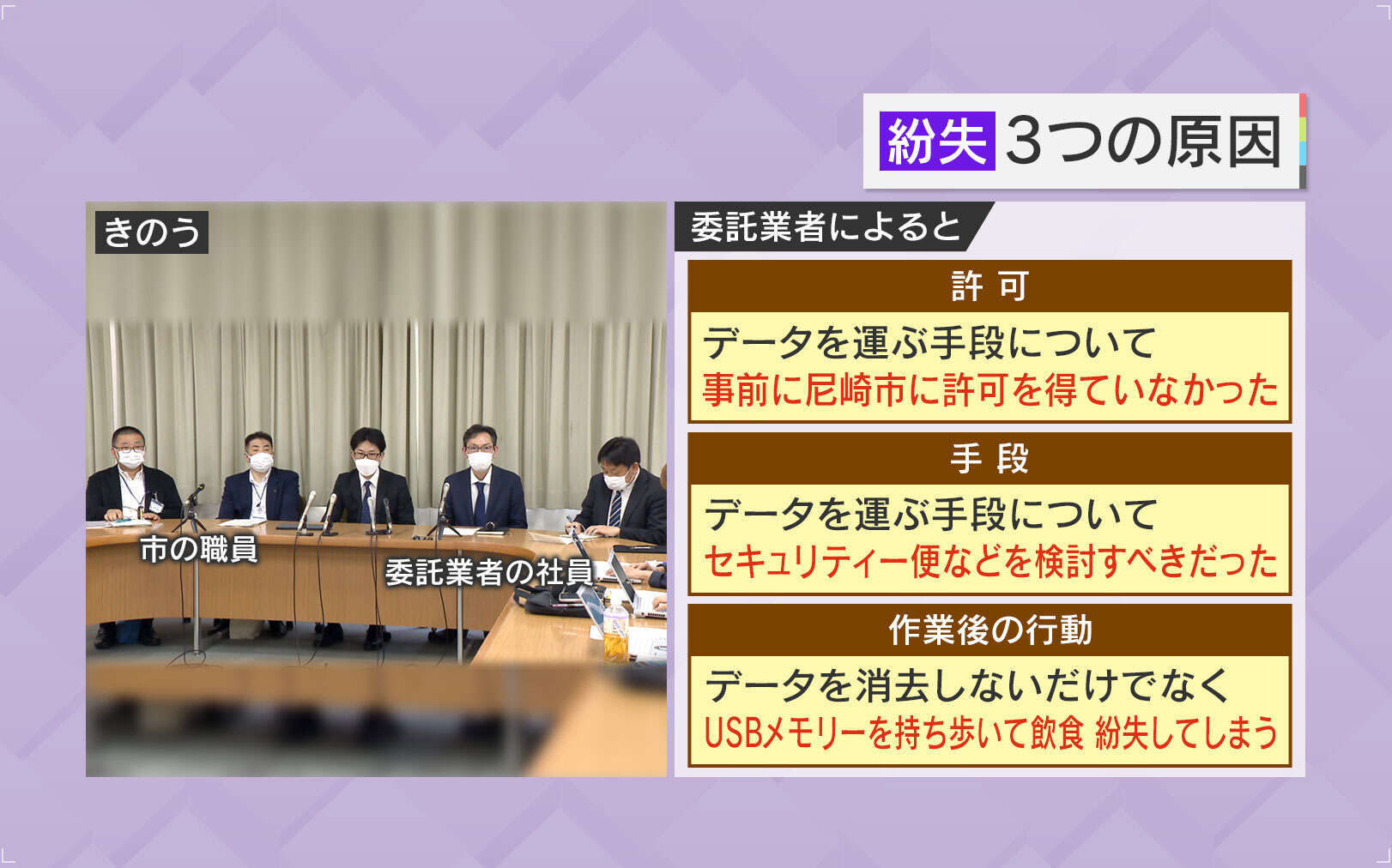 23日、尼崎市の緊急会見で委託業者は、「情報システムを預かる企業としては絶対に守らないといけないところを守れていなかった」と話しました。業者は紛失した3つの原因として「データを持ち出す手段について事前に市に許可を得ていなかったこと」、「データを運ぶ際にセキュリティー便などを検討すべきだったこと」、「作業後データを消去しないだけでなく、USBメモリーを持ち歩いて飲食したこと」をあげました。