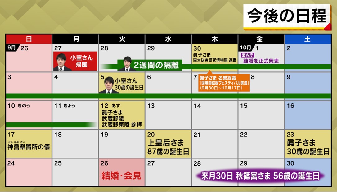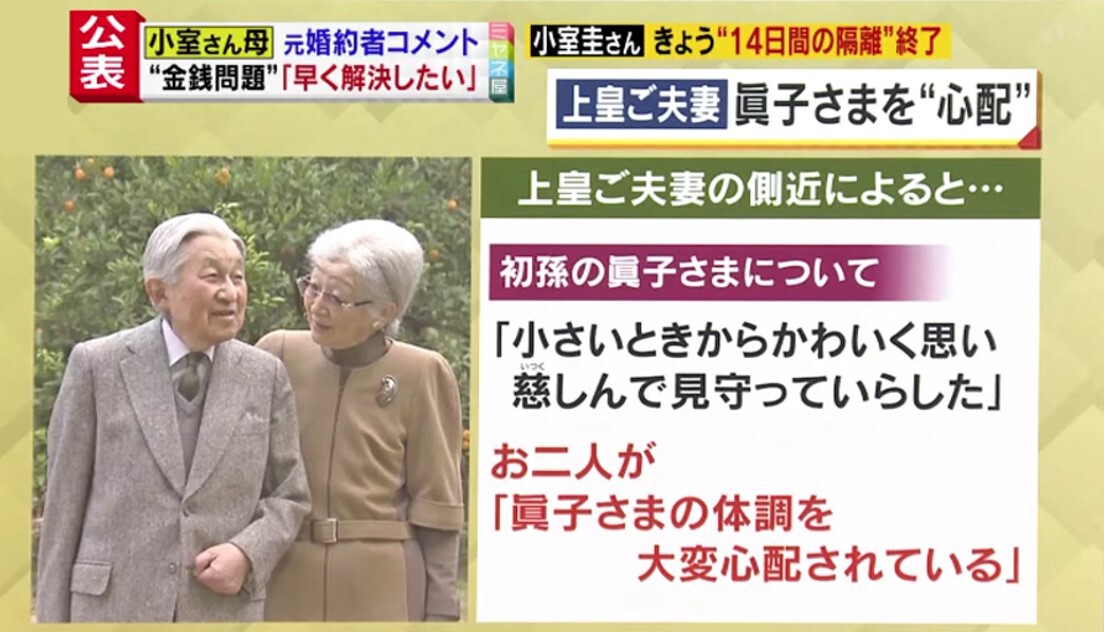 上皇ご夫妻の側近によりますと、上皇ご夫妻は初孫の眞子さまについて「小さい時からかわいく思い慈しんで見守っていらした」、お二人が「眞子さまの体調を大変心配されている」ということです。また、眞子さまが儀式を行わずに皇室を離れられることについては 「お寂しいだろうなと拝察している」、さらに眞子さまの上皇ご夫妻への挨拶については、「お受けになる気持ちはあると思います」としつつも、日程はまだ決まっていないということです。