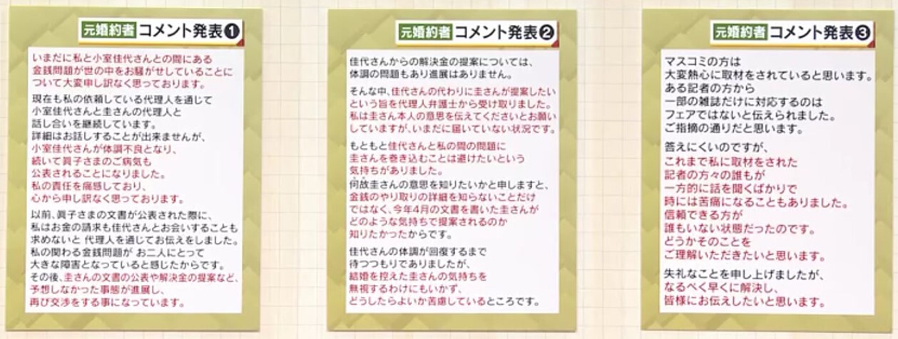 「あんまりどころか、全くと言っていいぐらい変わりはないですよね。私、別に説得に行ったわけではないんですけども、私は第三者として、小室家と元婚約者側でどっちもどっちっていうスタンスです。どっちかが100%悪いというとかは思っていないので。ですから元婚約者の方も冷静にお考えになったほうがいいんじゃないかと。例えば『私はお金の請求も佳代さんとお会いすることも求めない』と代理人を通じてお伝えしましたというくだりがありましたが、この後に『解決したと思っていない』っていうことを仰っていて、そのことはコメントでは触れていないのです。求めないけれども、解決したと思っていないというのはどういうことなのか。