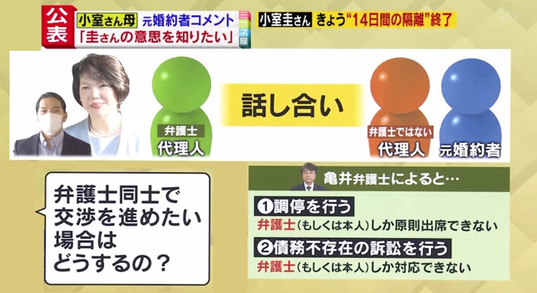 Q.小室さんの母と元婚約者が会う時には、2人きりで会うのか?代理人の弁護士が同席するのか、もしくは元婚約者の代理人もつくのか? 色々な状況が考えられるが?