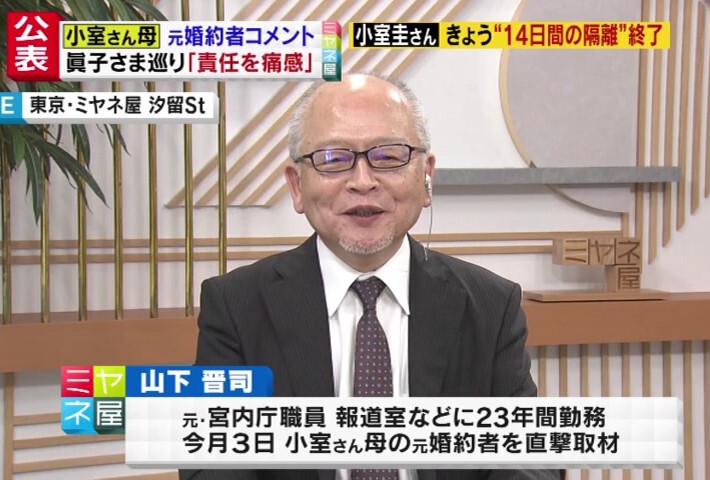 一方で、小室圭さんの母、佳代さんの元婚約者の男性がコメントを発表。眞子さまの病気公表について、「責任を痛感している」、金銭トラブルについて「早く解決したい」などと胸の内を明らかにしました。元婚約者の男性を直接取材した元宮内庁職員の山下晋司(やました・しんじ)さんと亀井正貴弁護士が独自解説します。