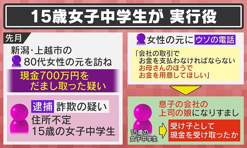 6月、新潟県上越市の80代の女性を訪ねて現金700万円をだまし取った疑いで、住所不定の15歳の女子中学生が逮捕されました。この女子中学生は、被害女性の息子の上司の娘になりすまし、“受け子”として現金を受け取ったとみられています。