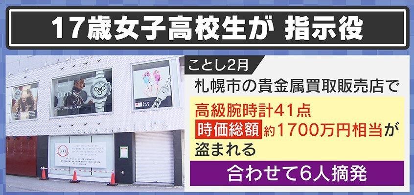 また、2月に札幌市の貴金属買取販売店で高級腕時計・計41点、時価総額約1700万円相当が盗まれる事件があり、6人が検挙されましたが、指示役の28歳の男の共犯者として17歳の女子高校生も逮捕されています。指示役は秘匿性の高いアプリで実行役に指示をしていました。そして女子高校生は、SNS上で高額報酬をうたい、“闇バイト”で実行役を募集していたとされています。