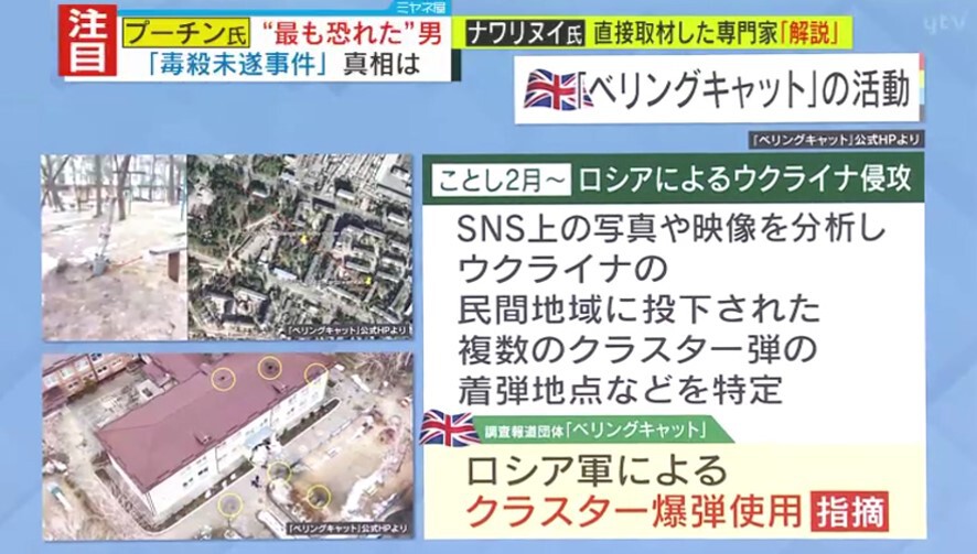 2020年、ナワリヌイ氏はイギリスの調査報道団体「ベリングキャット」と協力し、毒殺未遂事件の真相解明に乗り出します。「ベリングキャット」はSNSなどインターネット上の公開情報などを使用して、様々な調査をする国際的集団です。ロシアによるウクライナ侵攻では、SNS上の写真や映像を解析し、ウクライナの民間地域に投下された複数のクラスター弾の着弾地点などを特定しています。ナワリヌイ氏の毒殺未遂事件については、過去の調査から「使用された毒物『ノビチョク』の製造所はロシア国内で1か所だけ」と突き止め、製造所の所長の通話履歴などから犯行グループを特定しました。