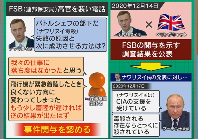 ナワリヌイ氏は偽名を使い、FSB(連邦保安局高官)を装って、毒殺を命じられたとされるロシアの諜報機関の関係者に直接電話をしています。その諜報機関の関係者から事件の関与を認める発言があったため、ナワリヌイ氏はベリングキャットと共に、FSBの関与を示す調査結果を公表しました。それに対してプーチン大統領は「ナワリヌイ氏は、CIAの支援を受けている。毒殺される存在なら、とっくに殺されている」と、この関与を否定しています。しかしその後、この諜報機関の関係者は行方不明となりました。