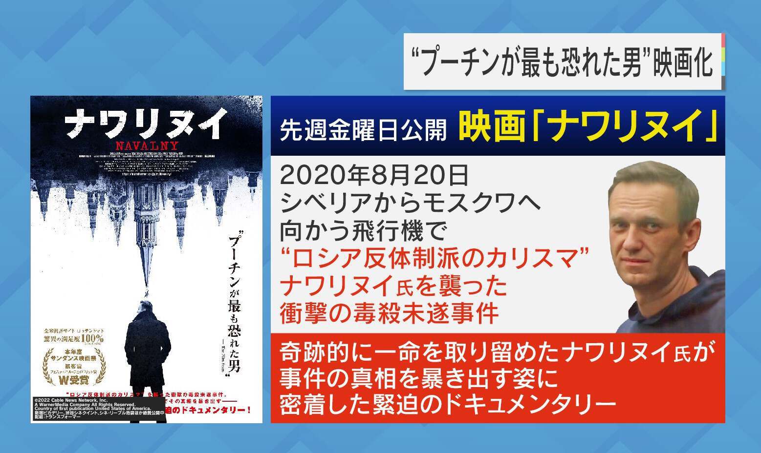 6月17日に公開された、ドキュメンタリー映画「ナワリヌイ」。2020年8月20日、シベリアからモスクワへ向かう飛行機で“ロシア反体制派のカリスマ”ナワリヌイ氏を襲った衝撃の毒殺未遂事件で、奇跡的に一命を取り留めたナワリヌイ氏が、事件の真相を暴き出すという内容です。この映画を見ると、プーチン大統領はナワリヌイ氏のことを「今、あなたが話題にした反体制派については…」と言ったり、「その人物…」、「あなたが言及した人間は…」、「どんな名前で呼ぼうが構わないが…」などと表現して名前を絶対に言わないため、ナワリヌイ氏の名前さえタブーなのではないかといわれています。