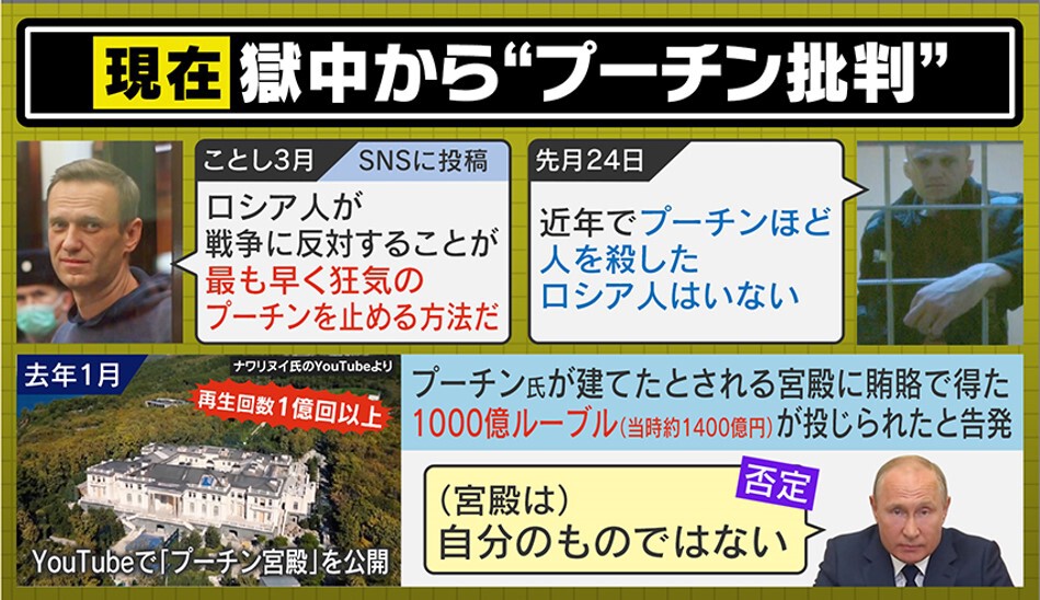 ナワリヌイ氏は、現在、詐欺と法廷侮辱罪で、禁錮9年の判決を受け服役していますが、獄中からプーチン大統領を批判しています。3月には、「ロシア人が戦争に反対することが、最も早く狂気のプーチンを止める方法だ」とSNSに投稿。5月にも、「近年でプーチンほど人を殺したロシア人はいない」としています。