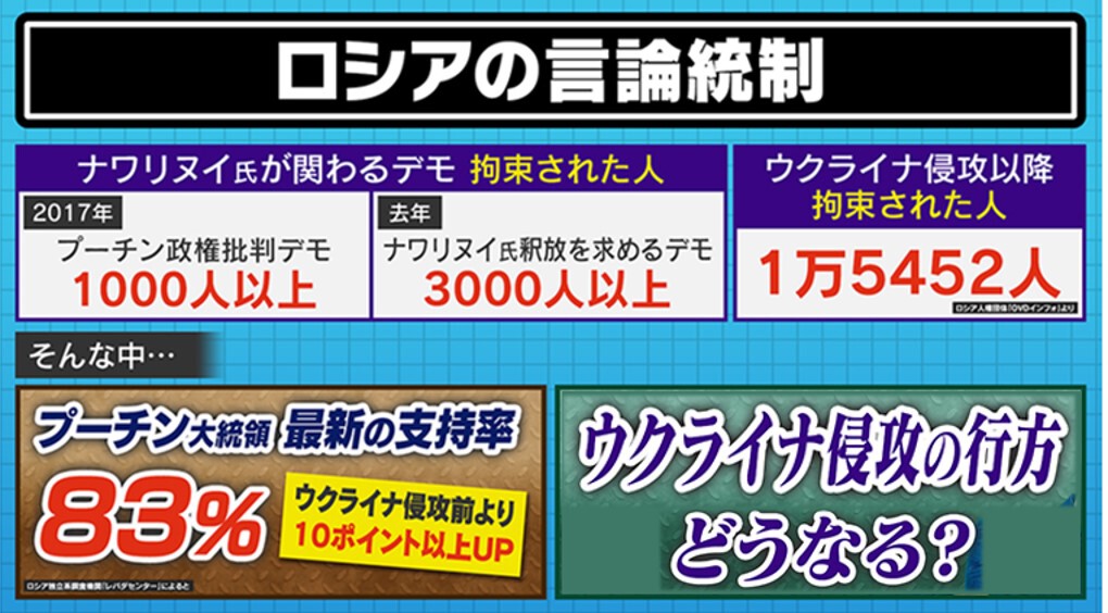 また、ナワリヌイ氏が関わるデモで拘束された人は、2017年は1000人以上、2021年は3000人以上にのぼっています。さらにウクライナ侵攻以降に拘束された人は1万5000人を超えています。そんな中でも、プーチン大統領の支持率は83%と、ウクライナ侵攻前より上がっています。