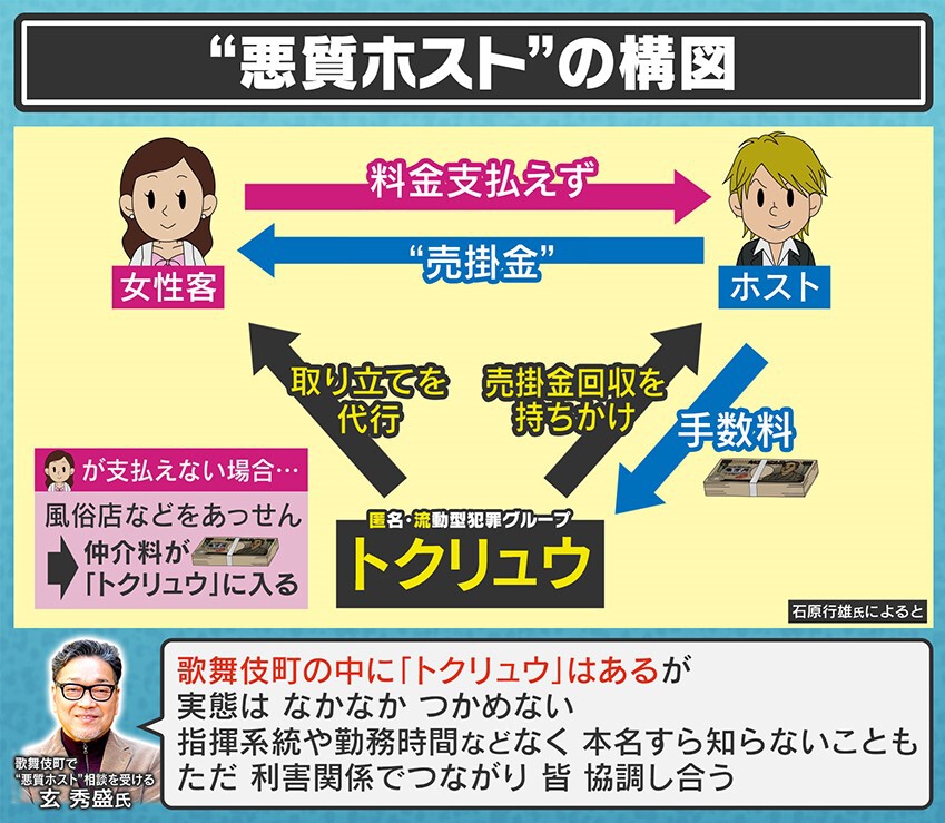 “悪質ホスト”と「トクリュウ」の構図ですが、まず女性客とホストがいて、女性は料金が払えないため“売掛金”が発生します。「トクリュウ」はホストに、この売掛金の回収を持ちかけるといいます。ホストが回収を依頼すると「トクリュウ」は女性への取り立てを代行し、回収できた場合はホストから手数料をもらいます。また、女性が売掛金を払えない場合は、「トクリュウ」が女性に風俗店などをあっせんして、その仲介料が「トクリュウ」に入るというシステムです。歌舞伎町で“悪質ホスト”問題などの被害にあった人の相談を受けている玄秀盛氏によると「歌舞伎町の中に『トクリュウ』はあるが、実態はなかなかつかめない。指揮系統や勤務時間などがなく、本名すら知らないことも。ただ利害関係でつながり、みな協調しあう」と話しています。