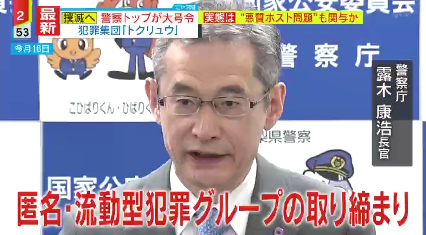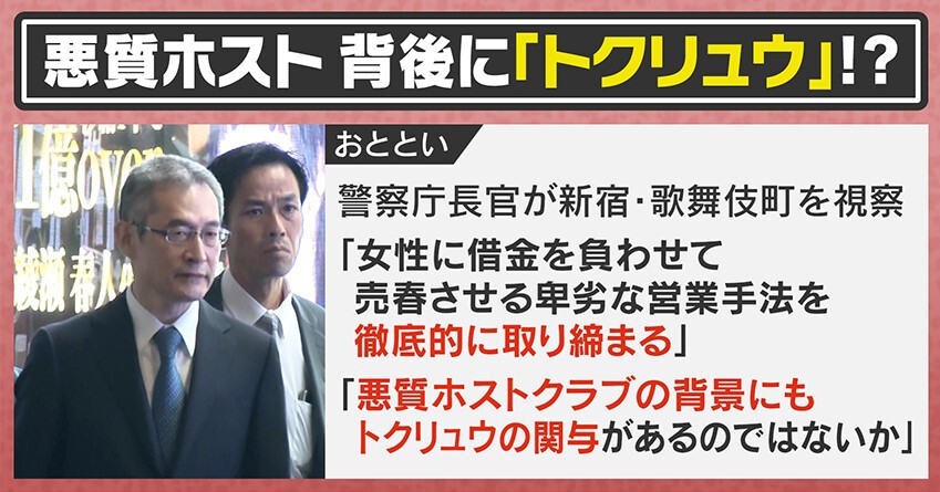 11月27日、露木康浩警察庁長官が新宿・歌舞伎町を視察して「女性に借金を負わせて売春をさせる卑劣な営業手法を徹底的に取り締まる」「悪質ホストクラブの背景にも、『トクリュウ』の関与があるのではないか」とコメントしています。