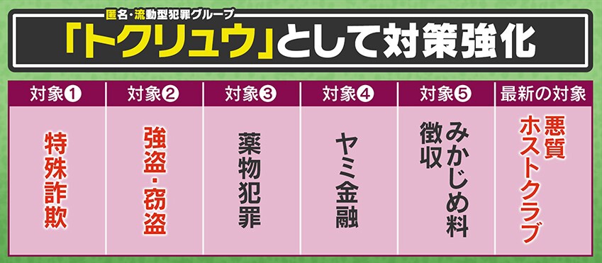 また、「トクリュウ」として対策強化している「特殊詐欺」・「強盗・窃盗」などに加えて、最近新たに「悪質ホストクラブ」も取り締まるようになっています。