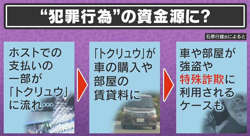 この“売掛金”の流れが“犯罪行為”の資金源になっているという指摘があります。まずこのホストでの支払いの一部が「トクリュウ」に流れ、その金を「トクリュウ」が車の購入や部屋の賃貸料にあてます。その車や部屋が、強盗や特殊詐欺に利用されるケースがあるのではないかということです。