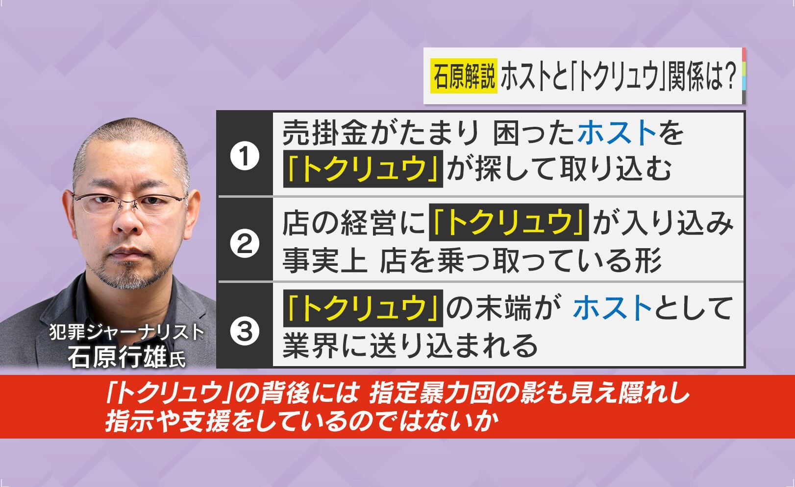 全てのホストクラブが悪質なのではなく、石原氏によると3つのポイントがあるといいます。一つ目は、「売掛金がたまり困ったホストを『トクリュウ』が捜して取り込む」といいます。二番目に「店の経営に『トクリュウ』が入り込み、事実上店を乗っ取っている形」もあるそうです。三番目として「『トクリュウ』の末端がホストとして業界に送り込まれる」といいます。さらに、「『トクリュウ』の背後には指定暴力団の影も見え隠れし、指示や支援をしているのではないか」と指摘しています。
