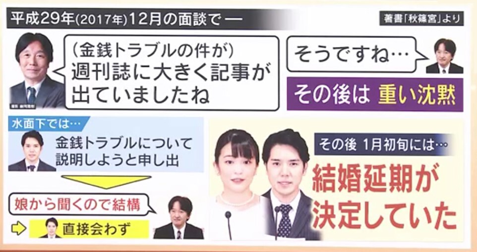 Q.金銭トラブル報道が出てすぐの2018年1月初旬には、眞子さんのご希望で結婚延期が決定していたということですが、秋篠宮さまが小室さんからの直接の説明を断られたのは、延期が決定していたからということですか?