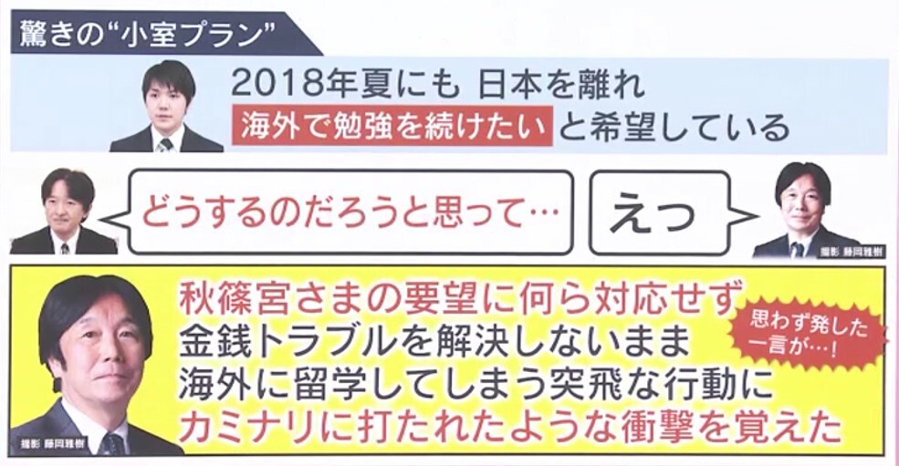 Q.眞子さんや小室さんには、「ちゃんと説明してくださいね」と言っているにもかかわらず、小室さんに「海外に行きたい」と言われて、秋篠宮さまは驚かれてショックを受けておられましたか?