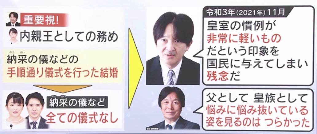 「そうですね、やはり眞子さんは『内親王』という大きな立場にあったわけですからね。もう少し、国民の祝福とか国民の理解を得られるような形での結婚というものを、考えていただきたかったと。PTSDというご病気もありましたので、なかなかその辺が難しかったのかと思いますけれども、やはり親心としては、もう少し違った形で娘を送り出したい、という思いが強かったのだと思います」