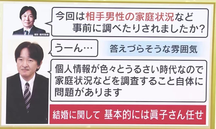 秋篠宮さまの結婚の際は、紀子さまの身辺調査も行われていました。江森氏が「今回は相手の男性の家庭状況など、事前に調べたりされましたか?」と質問すると、秋篠宮さまは「うーん…」と答えづらそうな雰囲気で、「個人情報が色々とうるさい時代なので、家庭状況などを調査すること自体に問題があります」と言い、基本的には眞子さん任せだったということです。
