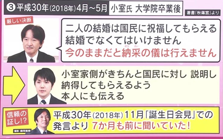 結婚関連行事が延期となる中、小室圭さんは単身ニューヨークへ留学します。2018年11月のお誕生日会見で秋篠宮さまは、「二人の結婚は国民に祝福してもらえる結婚でなくてはいけません。今のままだと納采の儀は行えません」と話し、小室圭さんに「小室家側がきちんと国民に対し説明し、納得してもらえるように」と伝えたことを明かされました。実は江森氏はこのご発言の内容を、会見の7か月前に秋篠宮さまから聞いていたそうです。
