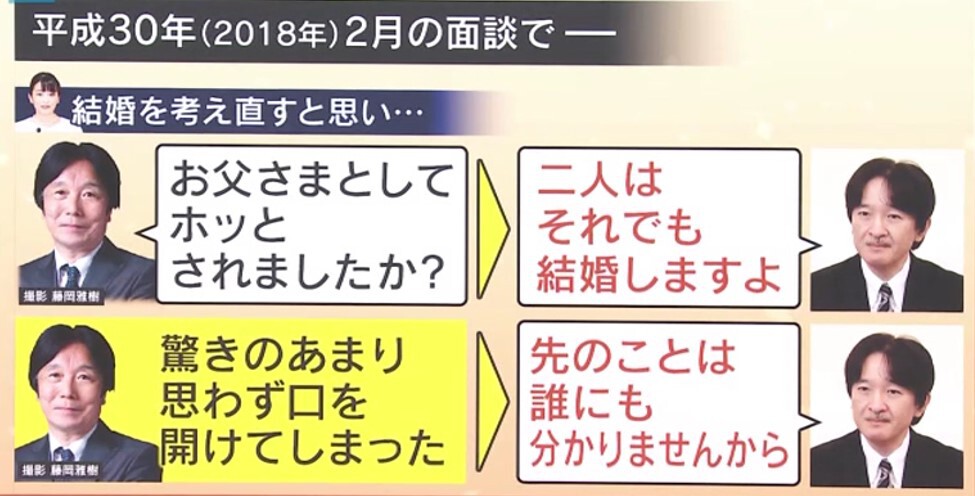 Q.ひょっとしたら眞子さんは結婚を思い直されるのかなと思って「お父さまとしてホッされましたか?」という質問をされたのですか?