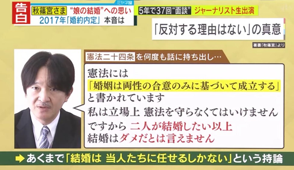 さらに秋篠宮さまは、「婚姻は両性の合意のみに基づいて成立する」と定めた「憲法二十四条」を何度も話に持ち出し、「私は立場上、憲法を守らなくてはいけません。ですから、二人が結婚したい以上、ダメだとは言えません」とおっしゃっていたということです。