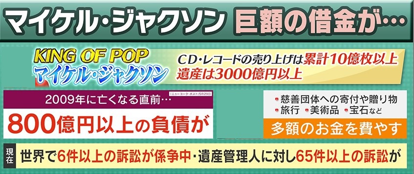 CD・レコードの売上は累計10億枚以上、遺産3000億円以上とも言われているマイケル・ジャクソン氏ですが、2009年に亡くなる直前、800億円以上の負債があったということです。その理由は、慈善団体への寄付や贈り物・旅行・美術品・宝石に多額のお金を費やしていたためだとされています。
