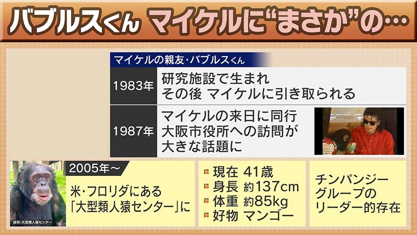 そして、番組独自取材、あのバブルスくんの現在です。バブルスくんは1983年に研究施設で生まれ、マイケル氏に引き取られます。その後、1987年のマイケル氏の来日に同行し、大阪市役所への訪問も大きな話題となりました。2005年からは、アメリカ・フロリダの「大型類人猿センター」で飼育されています。現在41歳、身長約137cm・体重約85kg、好物はマンゴーで、チンパンジーグループのリーダー的存在だといいます。