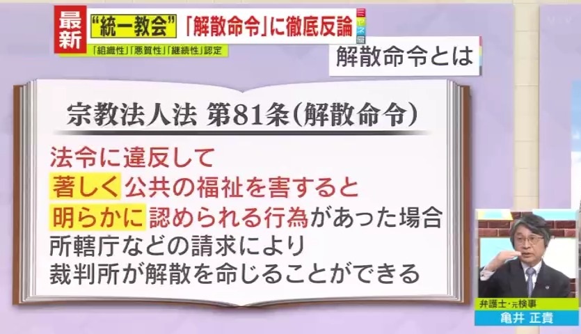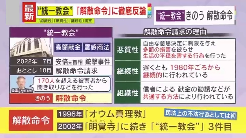 解散命令請求の理由としては、『悪質性』『継続性』『組織性』を挙げています。これまで法令違反を理由に解散命令となったのは、『オウム真理教』と『明覚寺』の2件。ただ、この2件は刑事罰を受けたケースで、民法上の不法行為としては“統一教会”が初だということです。