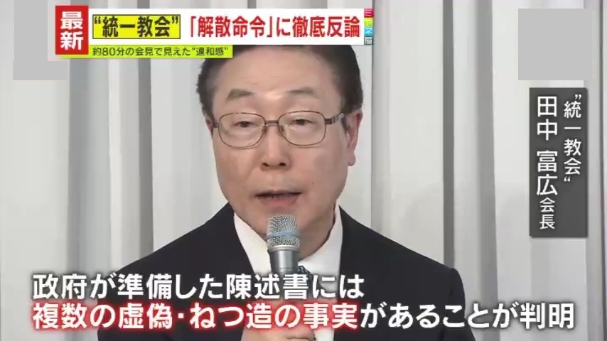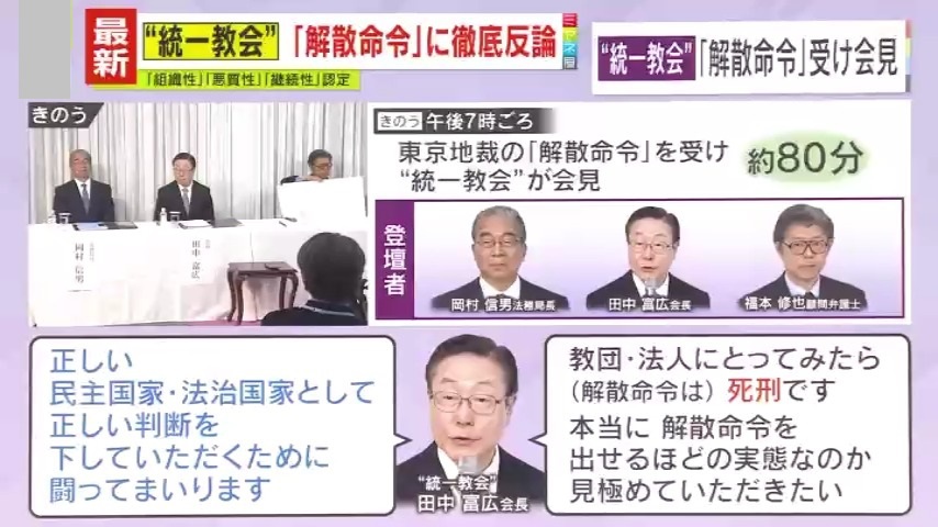 80分にわたる会見で田中会長は、「正しい民主国家・法治国家として、正しい判断を下していただくために闘ってまいります。教団・法人にとってみたら、(解散命令は)死刑です。本当に解散命令を出せるほどの実態なのか、見極めていただきたい」と話しました。