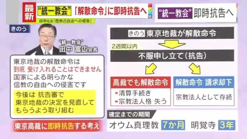 Q.今後、“統一教会”は即時抗告へということで、高等裁判所にいけば『清算手続き』や『宗教法人格を失う』ということですが、ひっくり返る可能性はありますか?