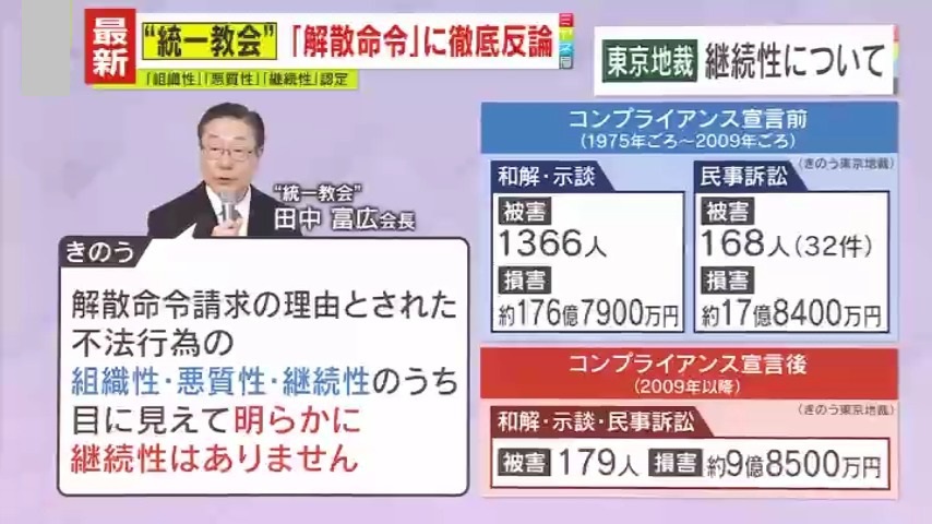 “統一教会”田中富広会長は2025年3月25日の会見で、「解散命令請求の理由とされた不法行為の組織性・悪質性・継続性のうち、目に見えて明らかに継続性はありません」と主張しました。しかし、コンプライアンス宣言前と宣言後の被害状況を見ると、和解・示談・民事訴訟を合わせて『被害』179人・『損害』約9億8500万円が、コンプライアンス宣言後に確認されたということです。