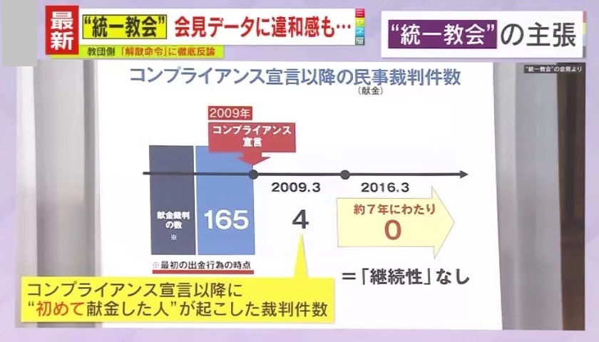 しかし、このデータ内の4や0という数字は、コンプライアンス宣言以降に“初めて献金した人”が起こした裁判件数を示していて、“コンプライアンス宣言前に献金をスタートさせ、その後被害を訴えた人”はカウントしていないということです。記者からの「限定的な条件で出された数字ではないか」という指摘に、福本弁護士は言葉を詰まらせていました。