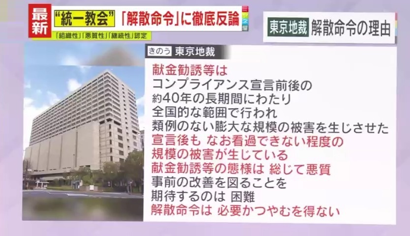 解散命令の理由として、東京地裁は「献金勧誘等は、コンプライアンス宣言前後の約40年の長期間にわたり全国的な範囲で行われ、類例のない膨大な規模の被害を生じさせた。宣言後もなお看過できない程度の規模の被害が生じている。献金勧誘等の態様は総じて悪質。事前の改善を図ることを期待するのは困難。解散命令は必要かつ、やむを得ない」としています。