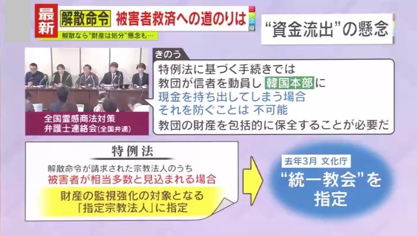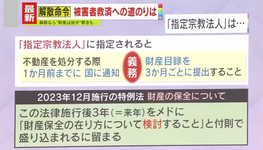 その“特例法”とは、「解散命令が請求された宗教法人のうち、被害者が相当多数と見込まれる場合、財産の監視強化の対象となる『指定宗教法人』に指定される」というものです。“統一教会”も2024年3月に指定されているといいます。