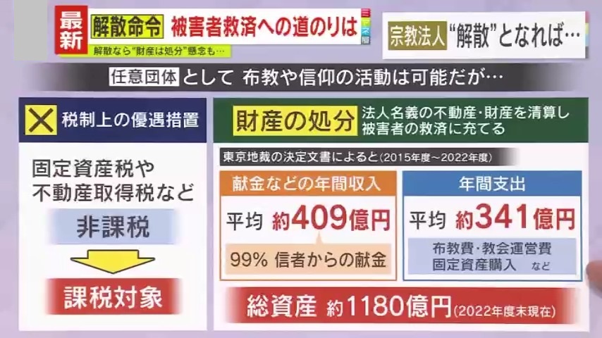 宗教法人が解散となった場合の『財産の処分』については、法人名義の不動産・財産を清算し、被害者の救済に充てるとしています。ただ、東京地裁の決定文書(2015年~2022年度)によると、献金などの年間収入約409億円の99%が信者からの献金で、年間支出は約341億円、総資産は約1180億円だということです(2022年度末現在)。