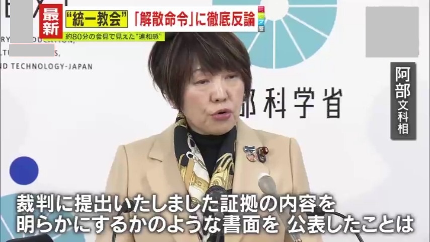 ねつ造の事実関係について問われた阿部俊子文科相は、「旧統一教会に関する解散命令請求は、適正に行ったものです。裁判に提出した証拠の内容を明らかにするかのような書面を公表したことは、いわゆる審理を非公開とする趣旨に反しており、適切ではない」と述べました。