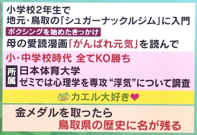 「めちゃめちゃ強いです、並木選手は。聖奈(せな)が当時、初めて負けた選手が並木選手なんです。その時は聖奈は、逃げ回っていましたから。(並木選手の金メダルは間違いない?)ほぼ間違いないです。女子のボクシングがもっと広がると、嬉しいです」