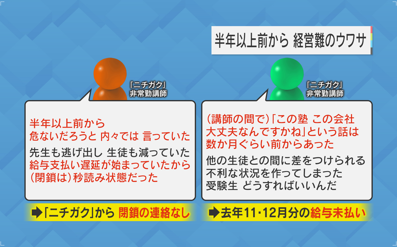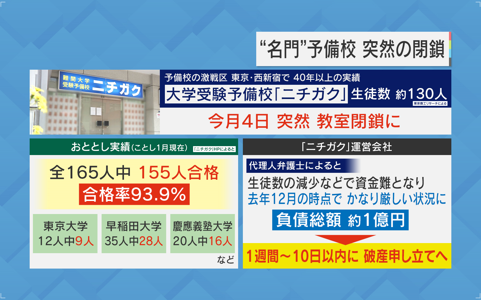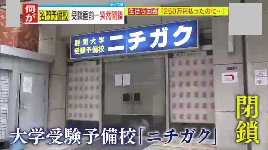 【困惑】受験直前に名門予備校『ニチガク』が突然の“閉鎖” 「先生も逃げ出し、生徒も減っていた(閉鎖は)秒読み状態だった」「全額返金されないと許せない」生徒や講師からは不安と怒りの声…いったい何が?