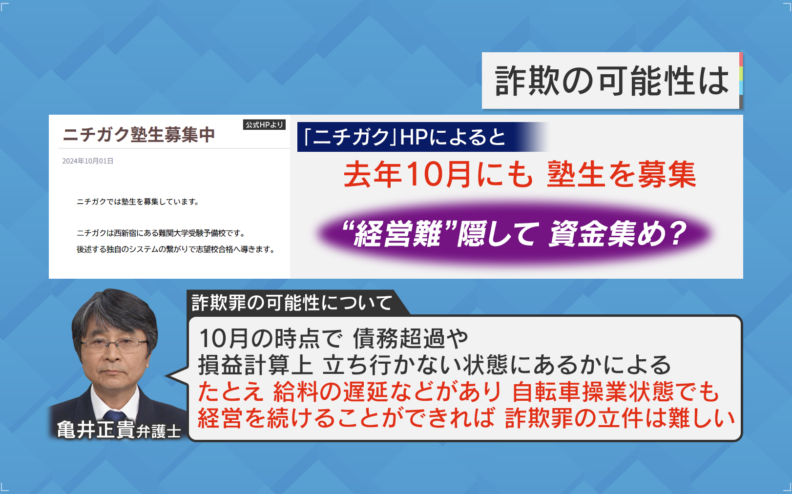 2024年10月にも塾生を募集していたこともあり、経営難を隠して資金集めの指摘もある中で、『詐欺罪』の可能性について、亀井正貴弁護士は「10月の時点で債務超過や損益計算上立ち行かない状態にあるかによる。たとえ給料の遅延などがあり、自転車操業状態でも経営を続けることができれば、『詐欺罪』の立件は難しい」と話しています。