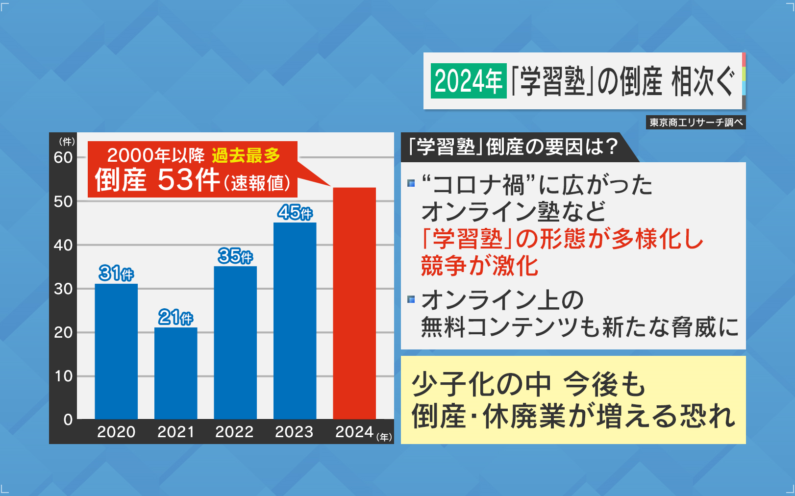 さらに今、学習塾の倒産が相次でいるといいます。2000年以降倒産件数が53件と過去最多に。倒産の要因は、コロナ禍に広がったオンライン塾など、「学習塾」の形態が多様化し競争が激化。オンライン上の無料コンテンツも新たな脅威になっているといいます。少子化の中、今後も倒産・休廃業が増える恐れもあるとのことです。