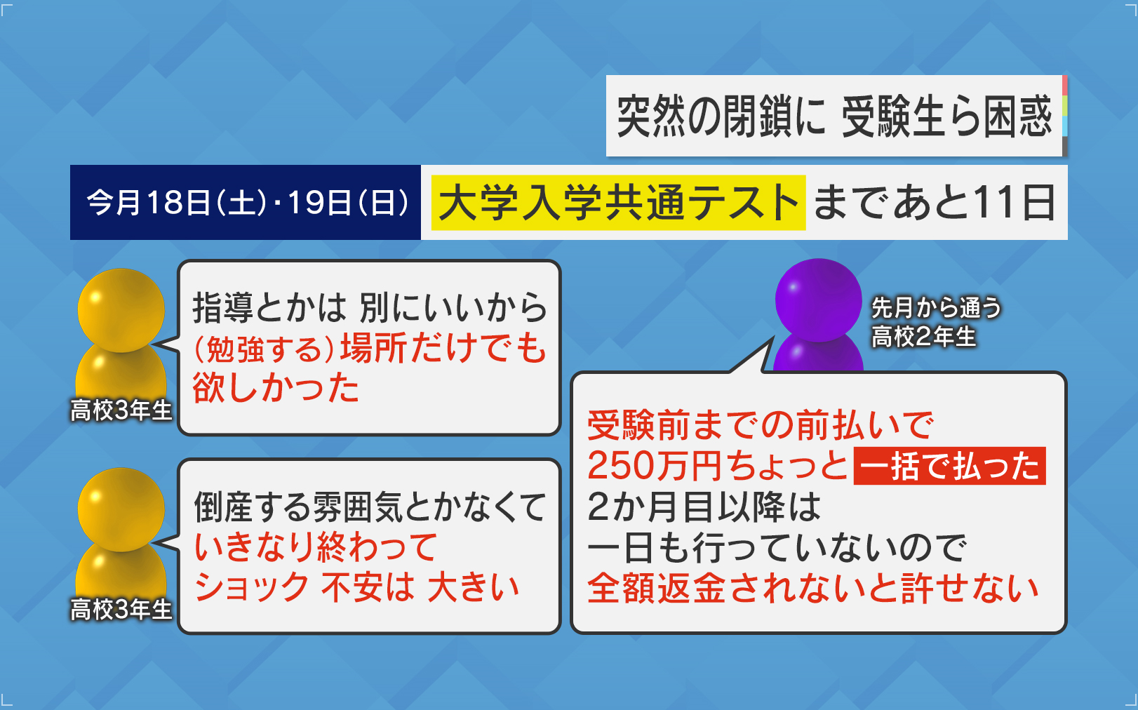 大学入学共通テストが迫り、受験シーズンを迎える中で、突然閉鎖した大学受験の予備校『ニチガク』。勉強の場を失い混乱する生徒たちからは不安や怒りの声が上がっています。今、名門予備校でいったい何が起こっているのか?亀井正貴弁護士の解説です。