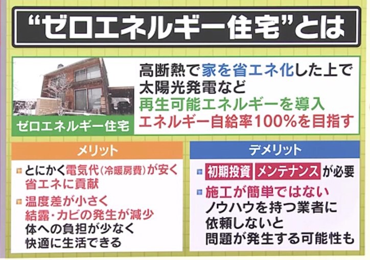 そして、究極の省エネと言われているのが“ゼロエネルギー住宅”です。高断熱で家を省エネ化した上で、太陽光発電など再生可能エネルギーを導入、1年間で使うエネルギー消費量の収支をゼロにすることを目指す住宅の事です。