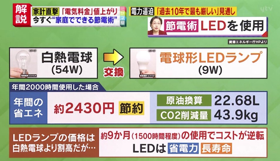 一つ目は「照明を“LEDタイプ”に変える」こと。白熱電球(54ワット)を同じぐらいの明るさのLED(9ワット)に替えると、年間で約2430円の節約になるということです。LEDランプの価格は白熱電球より割高ですが、省電力で寿命も長いため、約9か月(1500時間程度)の使用でコストが逆転するのだそうです。