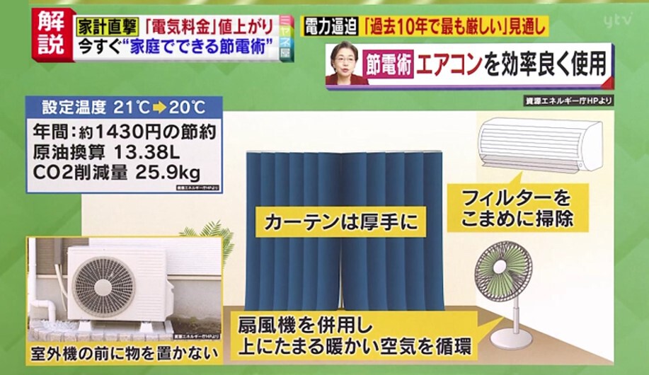 “家庭でできる節約術”二つ目は「エアコンの使い方を効果的に」すること。カーテンを厚手にして部屋の暖かい空気を窓から逃がさないようにする、エアコンのフィルターをこまめに掃除する、扇風機などで上にたまる暖かい空気を循環させる、室外機の前に物を置かないようにするなど、エアコンを効率よく使い、設定温度を1度下げることでも節約になるということです。
